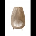 Lampe à poser libérant une lumière givrée, globe de polyéthylène protégée UV,entouré par un abat-jour tissé en fibre synthétique de polyéthylène. Abat-jour est disponible en, beige clair, blanc et marron. Cordon électrique est enfermé avec une protection en néoprène. (IP 55)